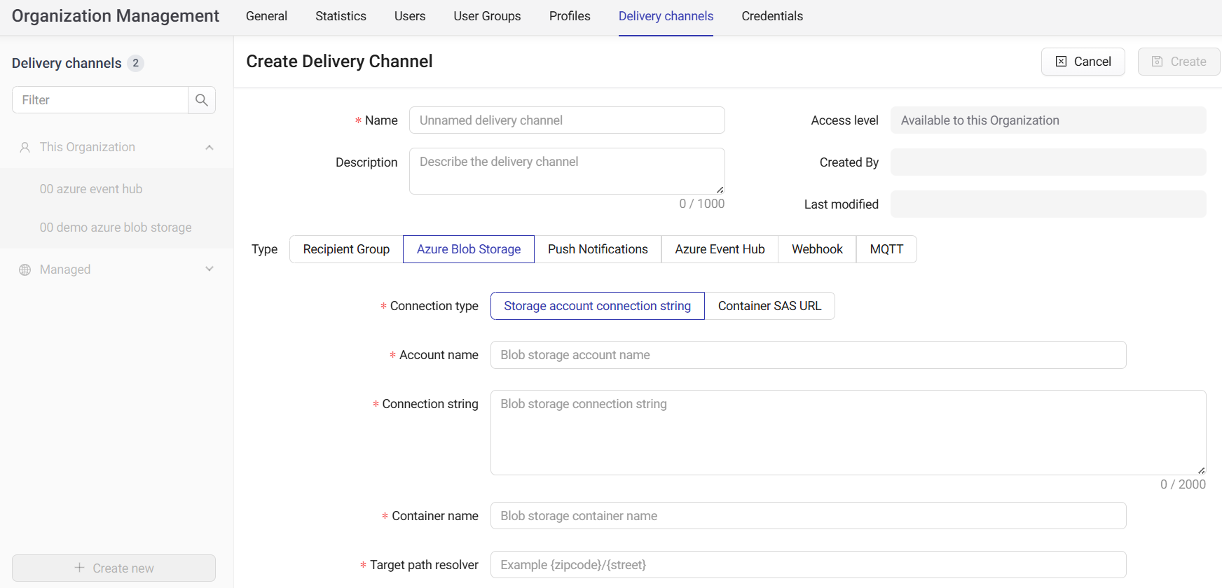 First, the delivery channel should be defined, i.e. the target for this data. It is found under the Organization management → Delivery channels view: