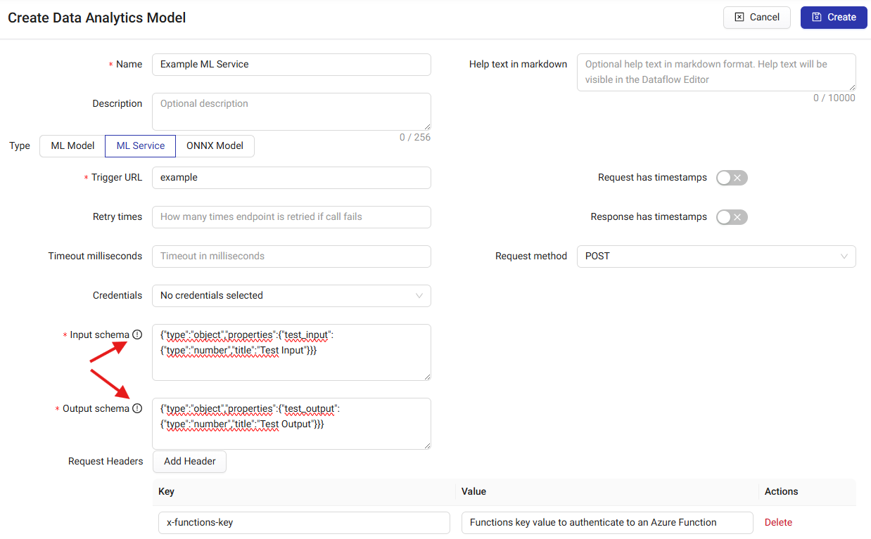 Because input and output data are sent within the request from IoT-TICKET, the input and output schemas need to be defined when creating the model in IoT-TICKET. Some examples between corresponding schemas and payloads can be found when hovering over the help icon. These may seem tedious, but a json formatting tool may help. Also, it is good practice to keep some kind of version control for these schemas.