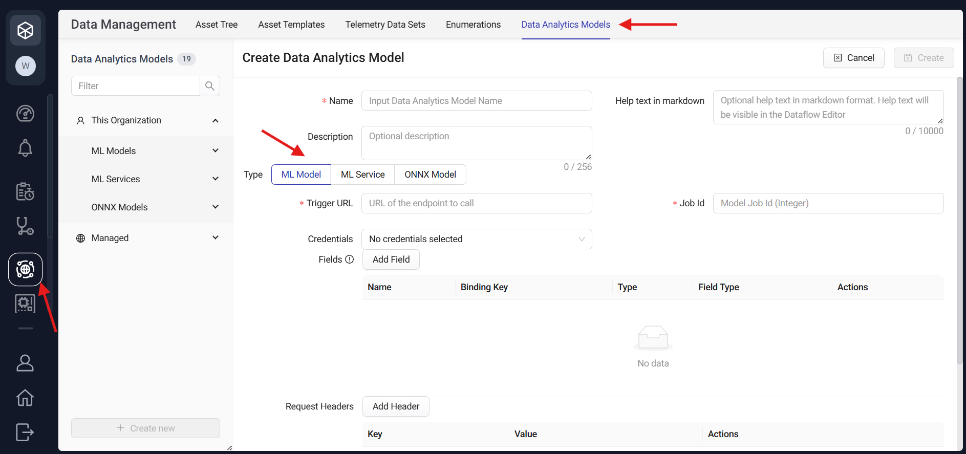 ML Models are for asynchronous external computation and they are designed for longer-running calculations, or for example model training. Here, the data is not sent within the trigger call, but is fetched separately using e.g. the DAS-SDK. ML Models were originally designed for Databricks jobs, and that is why there is a required Job Id field. It can be set to be a placeholder for other types of services than Databricks jobs. Also note that after creating the ML Model, its input and output fields cannot be edited, and the purpose of this is that changing the input and output fields would break existing Cloud App flows.