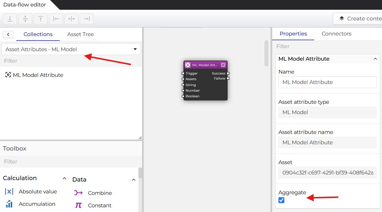 Aggregation can be used with ML Services by selecting the wanted data node from the Collections tab in the upper left corner, and then using the Group by block in Group by asset mode to input the values to the External Calculation block. This will then trigger the ML Service for each similar Asset attribute that existed on the same level or below this Cloud App's level in the asset tree. For example, if there were four asset attributes in the asset tree named "Number", the setup below would send the trigger request four times: