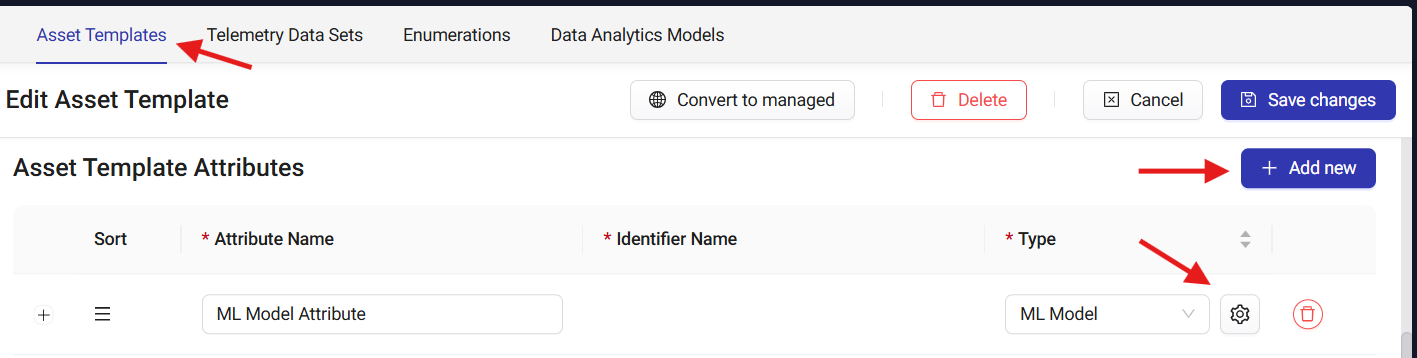 Additionally to defining the ML Model's information in the view above, it is defined in for an asset in the Asset Templates view. The input and output fields for the model can be of type Asset Attribute Id, String, Number, or Boolean. Out of these, the String, Number, and Boolean fields are flow inputs/outputs, i.e. single values that are defined in the Cloud App Flow. Meanwhile the Asset Attribute Id type fields are defined when adding the model for an asset template: